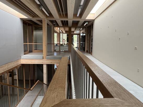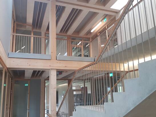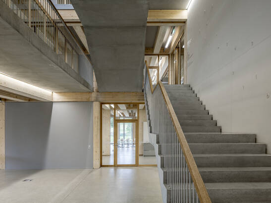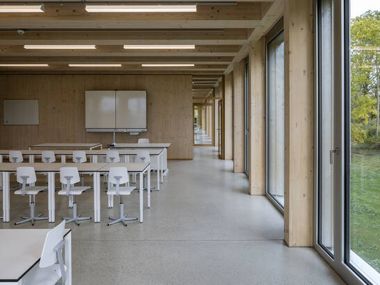 Die neue Schule kombiniert die Holzmassiv- und die Rahmenbauweise geschickt: Alle Geschossdecken und ein Teil der Innenwände für die Gebäudeaussteifung sind in Holzmassivbauweise aus Brettschichtholz erstellt. Die restlichen Innenwände sind nicht tragende Rahmenbauten. Die warmen Oberflächen von Holzwänden und -decken, sowie der ständige Austausch des Holzes mit der Luftfeuchtigkeit ergeben ein gutes Raumklima. Gut gedämmte Wände sind wichtig: Denn, je kleiner die Differenz zwischen der Oberflächentemperatur der Wände, Böden und Decken zur Lufttemperatur ist, desto behaglicher ist es in einem Raum. Darum fühlen wir uns in Holzgebäuden mit guter Wärmedämmung wohl – auch bei etwas tieferer Raumtemperatur. So können Gebäude energiesparsamer betrieben werden. Zudem hat Holz eine gefühlt höhere Oberflächentemperatur als Beton, Stahl oder Glas, was das Wohlbefinden zusätzlich steigert.
