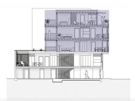 Wegen des geringen Gewichtes ist Holz für Aufstockungen fast immer die richtige Baustoffwahl. Die schnelle und lärmarme Bauweise mit Holz überzeugt bei An- und Umbauten. englerarchitekten gmbh sia haben ein Garagen- und Werkstattgebäude am Giessliweg in Basel saniert und mit drei Geschossen aufgestockt (farbig hinterlegt). Dabei haben sie viel Holz eingesetzt und sind mit der besonderen städtebaulichen Situation bestmöglich umgegangen.