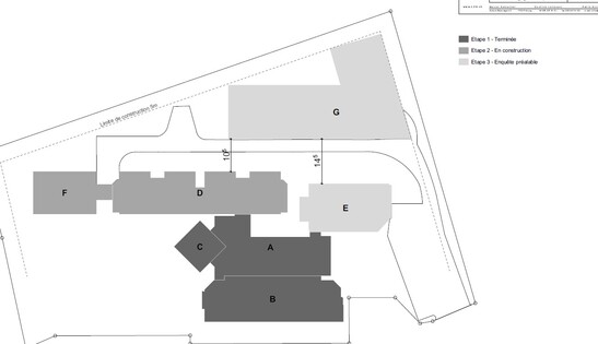 Grundriss des Freiburger Netzwerk für psychische Gesundheit (RFSM). Die Gebäude A bis E wurden saniert. Gebäude F ist ein Spitalbau aus Holz, der Bürokomplex G wird fast ausschliesslich aus Schweizer Holz gebaut. Quelle: LZA Architekten