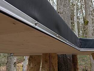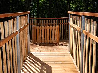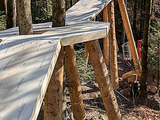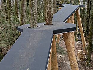 Die vorgefertigten Halbplatten wurden passgenau um den Baumbestand gelegt, mit EPDM-Kautschukfolie wettergeschützt verkleidet und mittels einem Alu-Profil fixiert. Entstanden ist ein bis ins Detail präzise ausgeführtes Holzbauprojekt, welches optisch überzeugt und den hohen Anforderungen an die Dauerhaftigkeit gerecht wird.