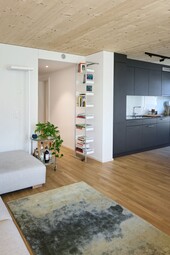 Aus Nachhaltigkeitsgründen wurde das Projekt vom Massivbau mit Holzfassade zu einem umfassenden Holzbau umgewandelt – und das zu einem späten Zeitpunkt. Somit musste die Statik der Gebäude in einem schon abgesteckten Rahmen erstellt werden, was eine enge Zusammenarbeit mit allen Beteiligten erforderte.