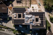 Für die Aufstockung kam die TS3-Technologie zum Einsatz, bei der Brettsperrholzplatten längs- und stirnseitig mit Giessharz verbunden werden. So entstehen massive, zweiachsig tragende Deckenplatten, die Lasten präzise und effizient auf die tragenden Wände und Stützen der bestehenden Massivbaugeschosse ableiten – diese Bauweise zeichnet sich durch die hohe Tragfähigkeit aus und ermöglicht schlanke Konstruktionen in Holzbauweise.