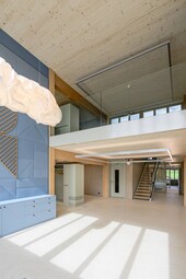 Das Bürogebäude ist ab dem Erdgeschoss vollständig als Holzbau konzipiert, inklusive des gekapselten Treppenhauses und des Liftschachts. Um das Raumklima zu verbessern und die Geschichte des Bauplatzes als Ziegelei sichtbar zu machen, wurde der Treppenkern mit ungebrannten Lehmziegeln ummauert. Der Gewerbebau vereint vielfältige Nutzungen wie Werkstätten, Lagerräume und Büros unter einem Dach. In der 8 Meter hohen Werkstatt ist ein 10-Tonnen-Kran auf einer Kranbahn aus Baubuche installiert. Das Flachdach beherbergt eine grosse Photovoltaikanlage mit 1300 m², die nachhaltige Energie erzeugt. Das Projekt verbindet moderne Holzbauweise mit historischen Elementen und nachhaltiger Energiegewinnung.