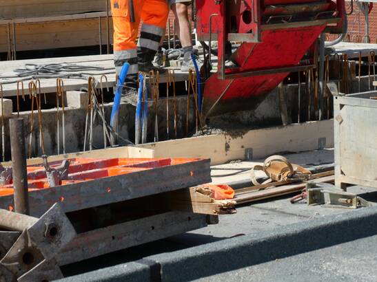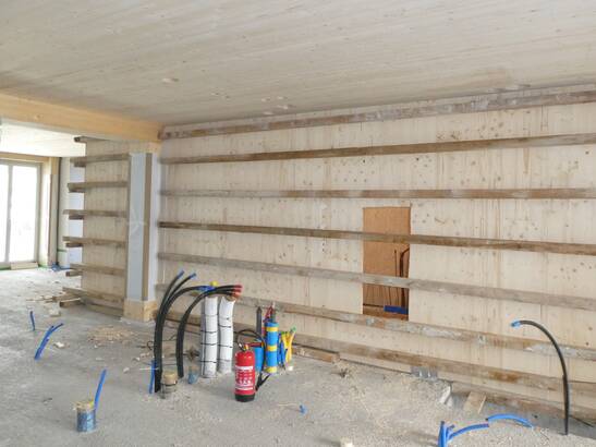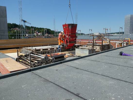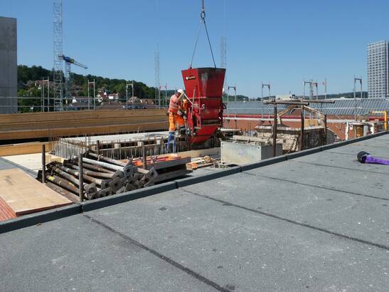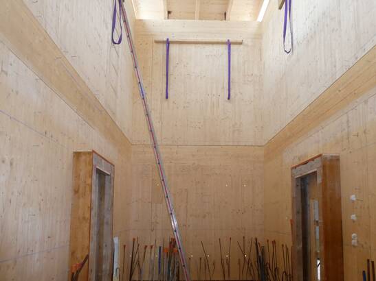 Die 42 Millimeter dicken 3-Schichtplatten wurden für den Brandschutz auf der Rauminnenseite mit 3x15 Millimeter Gipsfaserplatten verkleidet. Auf der anderen Seite dient die Platte als verlorene Schalung für den Beton. Bis der Beton ausgehärtet ist, wird das Treppenhaus provisorisch verstärkt.