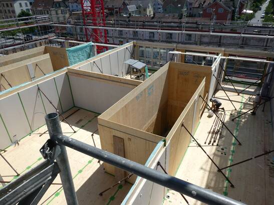 Das effiziente und ressourcenschonende Verfahren mit den nachträglich betonierten Treppenhauskernen hat Timbatec 2019 für das Haus Krokodil in Winterthur, einem Holzgebäude mit 248 Wohnungen, entwickelt. Seither wird es bei einer Vielzahl von mehrgeschossigen Holzbauten angewendet.