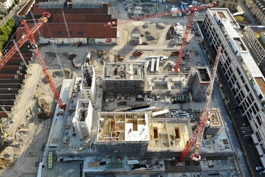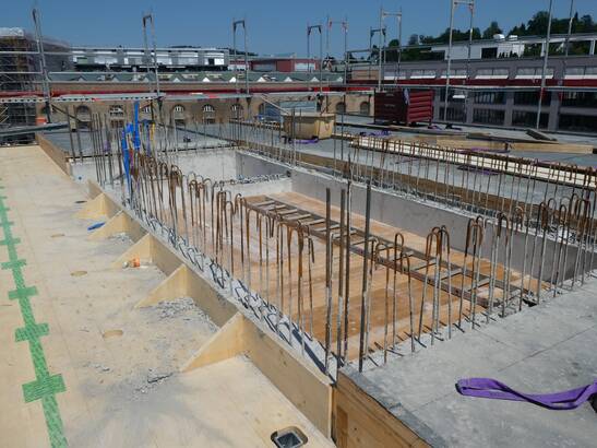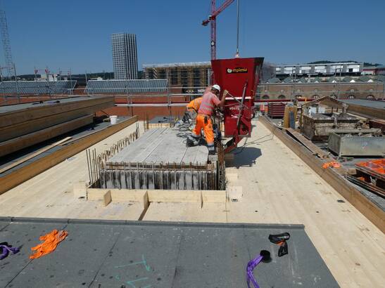 Die Vorteile der neuen Vorgehensweise liegen auf der Hand: Es braucht deutlich weniger Stahlprofile und Schrauben, die Verbindung vom Holzbau zum Betonkern ist einfacher und die Bauzeit kürzer. Der Auf- und Abbau des Gerüstes und der Schalung für den Betonkern entfällt und die Menge des eingesetzten Betons kann reduziert werden. Dies bei gleicher Leistung: Der nachträglich eingegossene Beton ist form- und kraftschlüssig mit dem Holzbau verbunden. Die Treppenhauskerne dienen der statischen Aussteifung der Gebäude und stellen die Fluchtwege im Brandfall sicher.