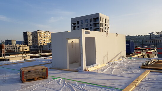 Les murs extérieurs ont été préfabriqués par Hector Egger Holzbau sous forme d'éléments en bois conventionnels. Ainsi ils peuvent être montés rapidement et avec précision sur le chantier. Les plafonds aussi sont arrivés sur le chantier sous forme d'éléments préfabriqués à caisson creux. Dans certains cas, des des plafonds en bois massif ont été utilisés pour des raisons statiques. Pour les murs de séparation des appartements et pour la cage d'escalier, le bois lamellé-croisé a été choisi comme matériau le plus approprié.