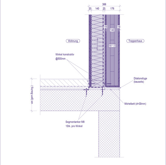 Détail de la transition entre les étages massifs et la construction en bois. Les éléments en bois sont posés sur posés sur un lit de mortier de 30 millimètres d'épaisseur et montés avec des ancrages à segments. On voit bien la cage d'escalier encapsulée en panneaux de bois lamellé-croisé.