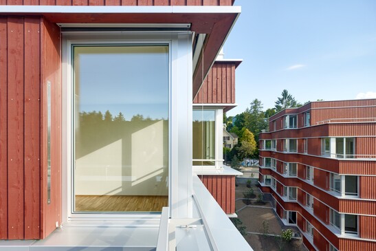 Les deux immeubles d'habitation de la Witikonerstrasse ont été réalisés sous la forme d'une construction hybride classique avec des plafonds porteurs en béton et des murs extérieurs non porteurs en ossature bois. Un bardage à clin vertical en épicéa/sapin, peint en rouge, a été utilisé comme revêtement de façade. Photo : Jürg Zimmermann, Zurich