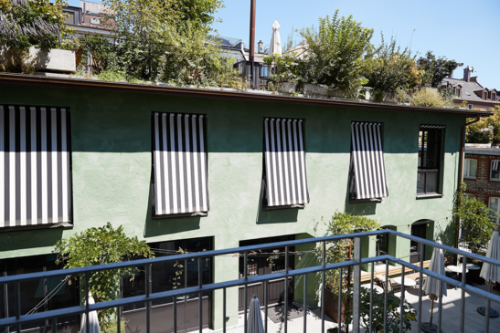 Côté cour, le bâtiment surélevé dépasse les constructions voisines. La construction en bois est séparée de la construction massive par une tôle horizontale.