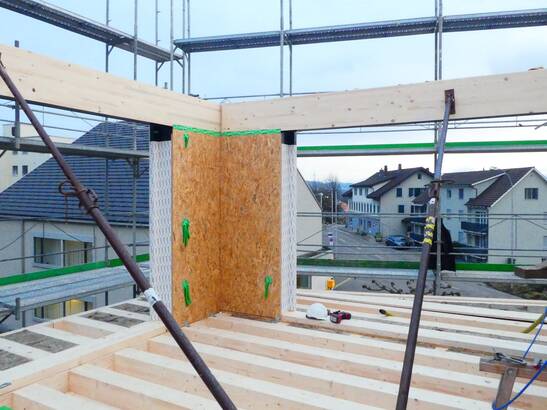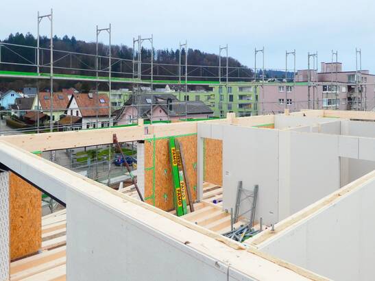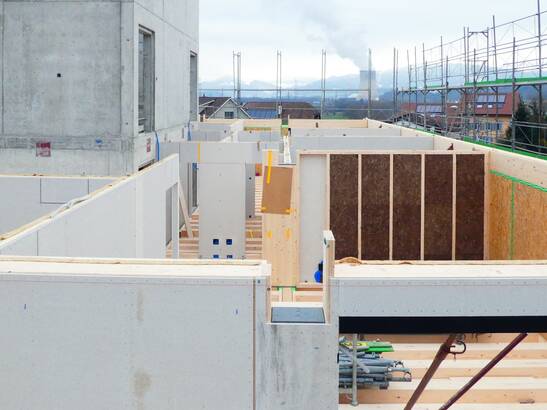 Au centre du village de Gretzenbach dans le canton de Soleure, un bâtiment en bois comprenant douze appartements et un magasin de village est en cours de construction. Les balcons sortent à plus de 3,5 mètres - sans piliers gênants. Une construction suspendue ingénieuse le permet.