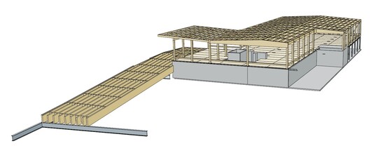 Le bâtiment de droite sera agrandi d'un étage. surélevé d'un étage. L'accès se fait par la rampe existante du bâtiment de gauche. et par la nouvelle rampe en bois entre les deux bâtiments.
