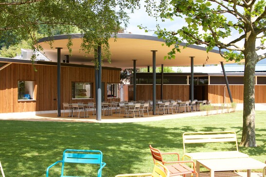 Un toit principal aux courbes organiques accentue l'accès accueillant à la plage et ombrage les places assises du restaurant. steinerARCHITEKTUR a conçu le toit en filigrane sur de fins poteaux en acier avec une trame d'à peine 8 x 8 mètres. Cette construction apparemment en apesanteur est possible grâce à la possible grâce à la technologie TS3.