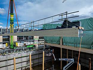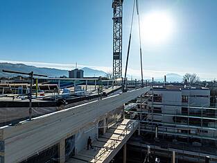 Le bâtiment principal Est mesure 97 mètres de long et environ 35 mètres de large. Actuellement, les programmes des bâtiments sont en cours d'érection. Les deux sous-sols en béton armé abritent les installations techniques, une salle de sport et le parking souterrain. Au-dessus, trois étages en bois sont destinés aux activités scolaires. Au-dessus du gymnase triple, une structure en treillis de deux étages (primaire et secondaire) servira de structure porteuse et sera, de par sa forme, l'une des plus grandes structures en treillis en bois jamais construites en Suisse. Longueur : 33,36 m, hauteur : environ 8 m. Des forces allant jusqu'à 1300 tonnes s'exercent sur la diagonale du treillis. Les équipes de professionnels de la construction en bois de BISANG Holzbau AG et de Kost Holzbau und Gesamtbau ont transformé plus de 2'500 m³ de bois en seulement six mois. En plus de la haute technologie de la construction, il s'agit d'un engagement fort en faveur de la construction durable en bois. C'est ainsi que fonctionne la protection active du climat.
