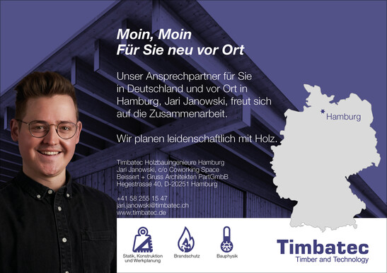 Nous sommes donc d'autant plus heureux que Jari Janowski soit présent à Hambourg depuis le 01.09.2025 en tant que directeur de Timbatec Allemagne. Il réunit le meilleur des deux mondes : Des connaissances suisses en matière de construction en bois et une profonde compréhension des exigences de la construction en bois en Allemagne.