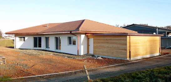 La maison individuelle se trouve dans un endroit rural du plateau fribourgeois. La maison en bois n'a pas de sous-sol et repose sur une dalle de fondation. La maison se compose d'un étage et d'un grenier. La façade extérieure est composée d'un panneau de fibres de bois avec un crépi extérieur. L'ensemble de la maison a été entièrement préfabriqué et après seulement 4 mois de construction, le bâtiment était prêt à être occupé.