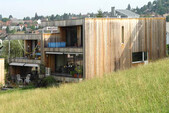 Les murs ont été construits en ossature bois, les plafonds en panneaux nervurés. Le parement inférieur, un panneau Livingboard, a également servi de plafond fini. Sur la face supérieure, le parquet massif en lames Douglas a été directement appliqué. Un coffrage Douglas non traité et ventilé par l'arrière a servi de coffrage extérieur. La cloison de séparation du bâtiment a été réalisée sous la forme d'une cloison à ossature bois double, revêtue des deux côtés, et recouverte sur la face extérieure de 2 plaques de plâtre armé de fibres de 15 mm.