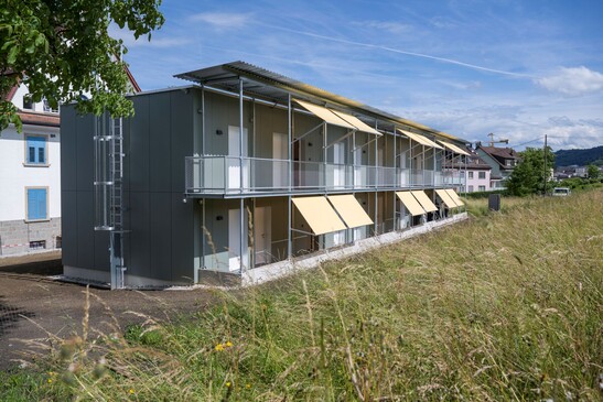 Le centre d'hébergement d'urgence de Thalwil est un bâtiment modulaire à deux étages de construction en bois. Long de 28 mètres et large de 7,5 mètres, il peut accueillir environ 40 personnes. L'accès se fait par une pergola extérieure en acier. Le projet a été planifié et réalisé en un temps record. La planification s'est déroulée de mi-2023 à mi-2024 et le bâtiment a été achevé en mai 2025 après huit mois de travaux, prêt à être occupé.