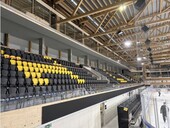 L’aménagement comprend neuf loges VIP pouvant chacune accueillir jusqu’à dix personnes, ainsi qu’un espace fondu ouvert pouvant recevoir une vingtaine d’invités. Les loges s’intègrent discrètement entre les poutres en treillis de la toiture existante. Cette implantation ingénieuse permet d’exploiter au maximum le volume disponible tout en préservant la légèreté visuelle de la structure. Les spectateurs bénéficient ainsi d’un point de vue exceptionnel sur la patinoire, dans un environnement à la fois chaleureux et exclusif, où le bois et le verre créent une atmosphère élégante et contemporaine.
