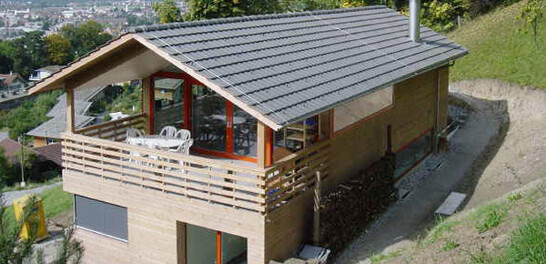 Une maison individuelle simple et rectangulaire répondant à la norme Minergie, construite sur une pente.