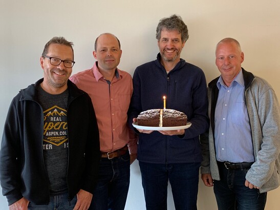 Marcel Herzog, Steffen Franke, Stefan Zöllig and René Wicki with birthday cake with TS3 joint.