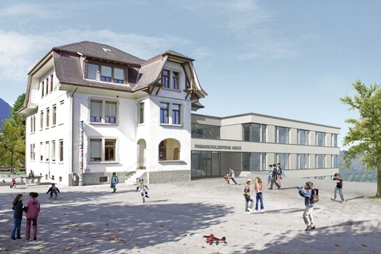 On Friday evening, the architects, the engineers and craftsmen together with the mayor of the municipality, Jolanda Luginbühl and the visitors present, celebrated the erection of the new school building section. The Pirmar school building of the school in Aeschi bei Spiez was extended by a new three-story wooden building. wooden construction. In the new part of the school building there are classrooms, group and rooms and space for a kindergarten. The three floors above ground were built entirely of wood.
