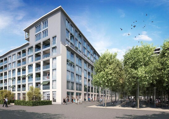 The perimeter block development with an inner courtyard of 2000 m2 is designed as a skeleton building. skeleton construction. The wooden columns are a striking part of the architecture. The visible wooden structure gives the living spaces a clear structure and creates a natural feeling of space. In the case of the "Crocodile", only the basement basements and the staircases are made of reinforced concrete, the rest is built wooden elements.