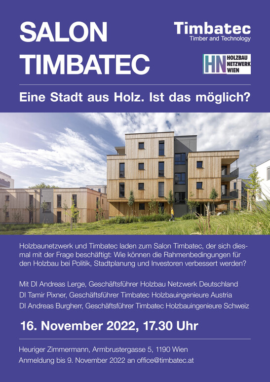 Holzbaunetzwerk and Timbatec invite to the Salon Timbatec in Vienna, which this time deals with the question: How can the framework conditions for timber construction be improved in politics, urban planning and investors?