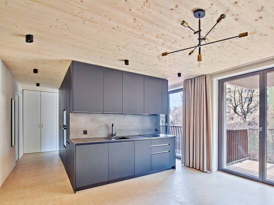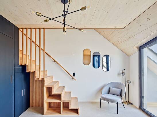 Now the seven-story wooden building is completed and the larch shingle facade shines with its golden yellow color. Soon it will take on a silver-gray patina and is very durable thanks to the natural resins and ingredients. The facade does not require maintenance or painting and has a service life of up to 80 years.