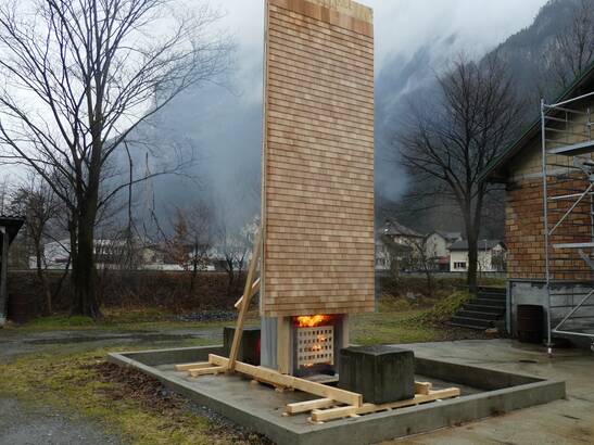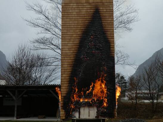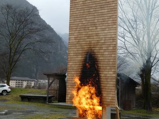 During the tests in Andermatt, an initial small-scale fire test on a sample served to roughly assess the fire behavior. In a second step, a real fire test on a piece of facade followed in consultation with the authorities.