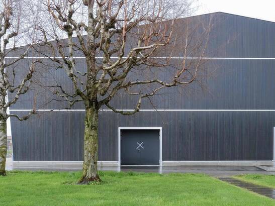 The infill panels between the steel frames were removed and replaced by prefabricated wooden elements. They stiffen the hall so that it meets the structural requirements in force today. On the inside, the steel beams remain visible, which shapes the hall space through the grid of filigree steel frames. In this way, all elements were planned around the existing steel frame. The exterior facade is characterized by the vertically mounted wooden formwork.