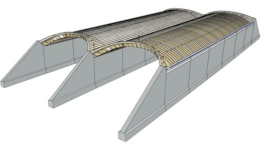 3D planning of the wooden structure. It rests on cast-in-place concrete walls.