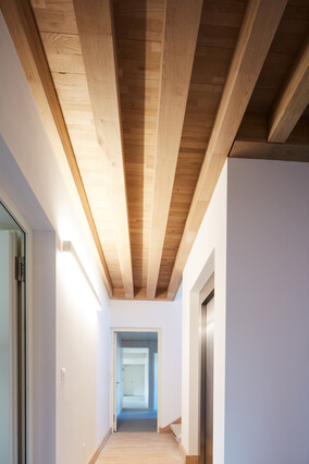 This is made possible by the encapsulated structures made of cross-laminated timber. The walls and ceilings are also all made of cross-laminated timber and the staircase is a solid oak construction.