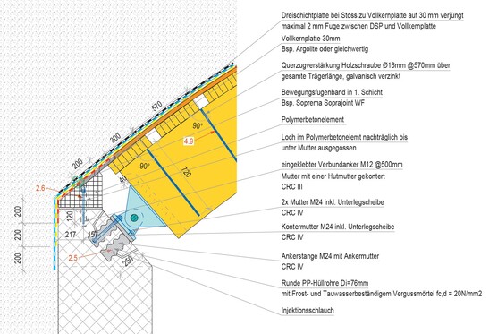 ARGE FERA was commissioned with the execution together with Aarvia Bau AG and Häring AG. The 156 BSH arch girders required were prefabricated at Hüsser Holzleimbau AG in Bremgarten. The girders are 17.4 meters long, have a cross-section of 24 by 76 centimeters and weigh two tons each. For this purpose, spruce boards were glued in a dimensionally stable manner using a large glue press and an RF adhesive. Steel joints on both sides of the girders serve as supports.