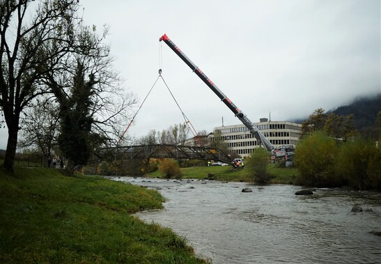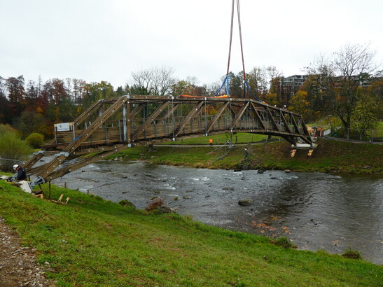 The Tüfi-Steg pedestrian and bicycle bridge in Adliswil is getting on in years. Analyses showed that replacing the bridge is almost as expensive as a costly renovation. Today, the new bridge - with beech wood from the surrounding forests - was installed over the Sihl.