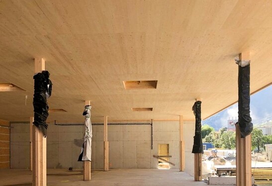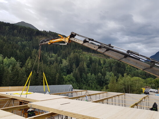 In the Austrian Tyrol, a wooden building is currently being built with a 650m2 cross laminated timber panel. This is a world record! It is made possible by the TS3 technology - a development of Timbatec together with the ETH Zurich and the Bern University of Applied Sciences.