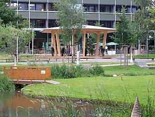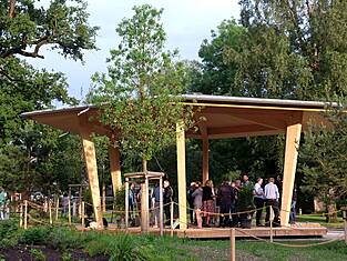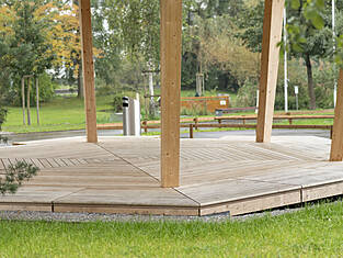 The basic shape of the pavilion is based on the classic typology of historical park buildings. Its hexagonal floor plan offers access from all sides, seating steps and a ramp for wheelchair users. This concept makes it the focal point of the new extension and creates a link between the private and public spheres.