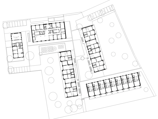 The project comprises 2 apartment buildings, 9 terraced single-family houses, 1 health center and a library with a multi-purpose room. The pergola, pitched roofs and wooden facades blend in perfectly with the rural surroundings. All four new buildings are constructed entirely in wood from the floor slab upwards. The rental offer was very popular. All residential units are rented out.