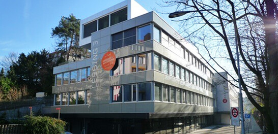 The cantilever of the second attic floor was solved with the load-bearing 120 mm cross laminated timber panels. The ceilings and the roof were formed with box girder elements over 7.20 m and connected to the load-bearing cross laminated timber panels with support battens. For bracing, the stairwell and a wall slab in solid construction were led up to the roof. The ceiling and roof slabs were connected to these.