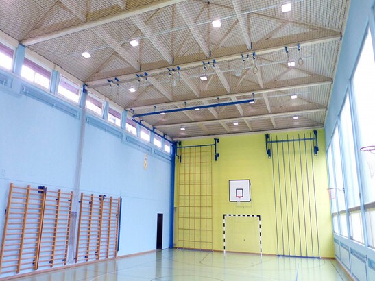 Since the gymnasium is directly adjacent to the community center, the external appearance could not be changed. The new supporting structure was built with trusses that span the width of the hall at intervals of 4.5 meters.