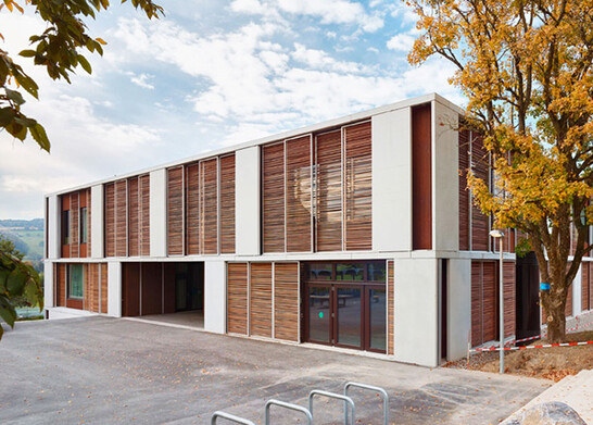 The new Schachenmatten school building in Bonstetten is a hybrid construction of wood and concrete. The ceilings are made of concrete, while the exterior walls are made of wood. According to the architect, this solution was chosen on the one hand because wood in combination with exposed concrete creates an architecturally high-quality appearance and wood in the classrooms creates a pleasant atmosphere for the students. In addition, wood has the advantage that this building material allows a dry construction and that the construction time is significantly shorter with wood compared to solid buildings.