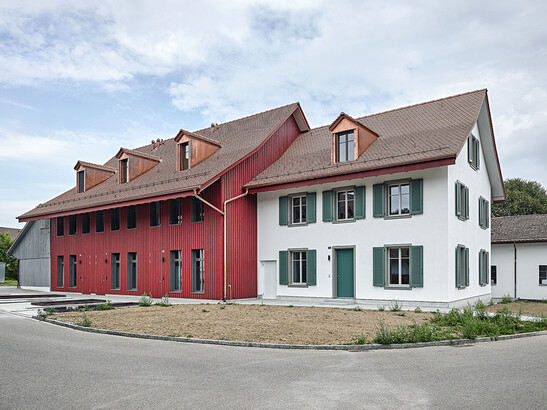The Zwinghof in Neerach had not been used as a farm for some time. Therefore, the owner, Axenstein Park AG, had the barn and the residential house replaced by new buildings made of wood. The two new houses have the same appearance as the original buildings. Instead of the barn, three apartments were built side by side. The apartments in the volume of the former barn extend over three floors, some of them with rooms spanning several floors, which are accessed via the inner staircase. The first floor is used for living: here are located the living and dining rooms and the kitchen. The bedrooms are located on the upper floor and in the roof.