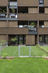 The underground garage of the multi-family house was built in solid construction. From the ceiling above the basement, the residential building is completely made of wood. Load-bearing components such as walls and ceilings, as well as the elevator shaft, are made of cross-laminated timber.