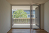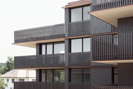 The TS3 connection by means of joint grouting allows the construction of joist-free skeleton building structures made of wood with slender, point-supported slabs. By activating the secondary bearing direction, the same ceilings can be built with wood. Because of the low thermal conductivity of wood, there is no need for elaborate cantilever connections. The CLT panel can easily run from the interior to the exterior. The concrete stairwell braces the building.
