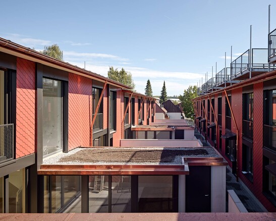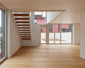 We supervised this development in Rain. The existing underground parking garage was upgraded so that the two-storey buildings could be constructed above it. Above ground, everything was built in timber with visible wooden ceilings. A busy main road had to be taken into account in terms of building physics.
