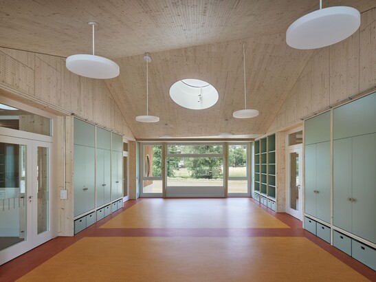 The new single-storey building is designed in visible cross-laminated timber and finished with a pitched roof made of screw press-bonded ribs. The exterior wall structure was insulated using conventional and prefabricated timber frame elements. The «jagged canopy» impresses with its inviting overhang and the visible TS3 joints.