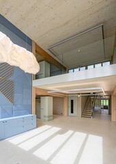 The office building is designed entirely as a timber construction from the ground floor upwards, including the enclosed stairwell and lift shaft. To improve the indoor climate and highlight the history of the building site as a brickworks, the stairwell was walled in with unfired clay bricks. The commercial building combines a variety of uses such as workshops, storage rooms, and offices under one roof. A 10-ton crane is installed on a crane runway made of construction beech in the 8-meter-high workshop. The flat roof houses a large 1,300 m² photovoltaic system that generates sustainable energy. The project combines modern timber construction with historical elements and sustainable energy production.