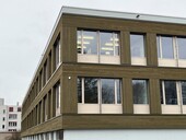A nearby timber construction company precisely prefabricated the facade elements using timber frame construction. A mobile crane lifted the exterior wall elements between the facade scaffolding and the building structure. These were attached to the building shell. The chosen construction method allowed the building envelope to be closed quickly, enabling an early start to the interior work. The final assembly step was the installation of the facade cladding.