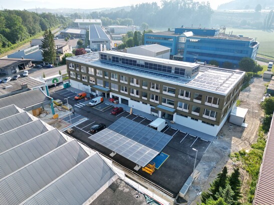 The Leimere Park commercial center was designed as a multifunctional building that meets various needs and offers tenants a wide range of benefits. The entire first floor is designed as a retail store. The upper floors contain flexibly divisible commercial space that can be used for a variety of purposes. The large photovoltaic system on the roof generates electricity for the property and for the electric charging stations for cars and bicycles. The building is designed as a hybrid construction. The load-bearing structure in solid construction was built in advance and clad with exterior wall elements in timber frame construction.