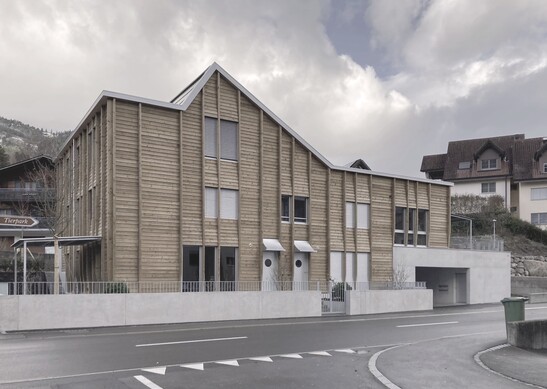 The exterior and interior walls of the residential floors were constructed using prefabricated elements and support the solid wood ceilings made of horizontal glulam. The special geometry of the gable roof required the use of a tie rod system.